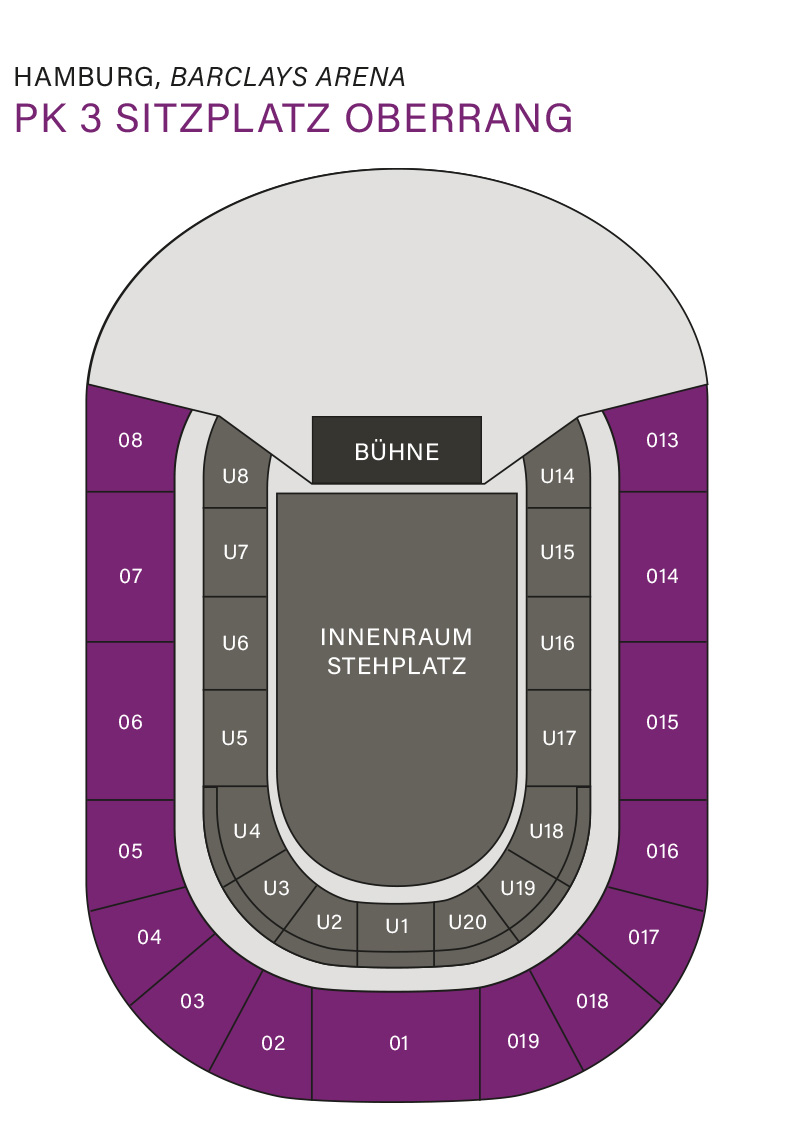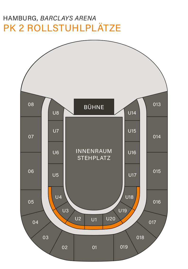 o Erhöhtes Podest vorhanden? Nein, die Rollstuhlplätze befinden sich in Reihe 19 der Blöcke U1 – U4 und U18 – U20 im Unterrang.